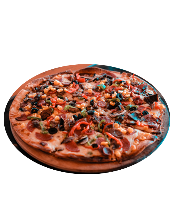 Mozarella peynir, pizza sos, sosis, sucuk, kavurma, mısır, zeytin, mantar, biber, domates